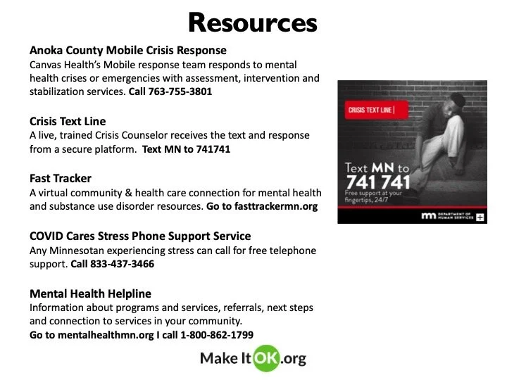 After meeting with HealthPartners and learning more about how to bring Make It Okay to Anoka County, several members of our group were trained as MIO ambassadors in 2020.
