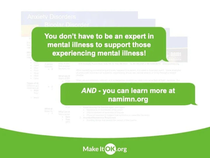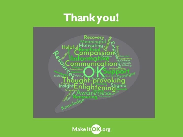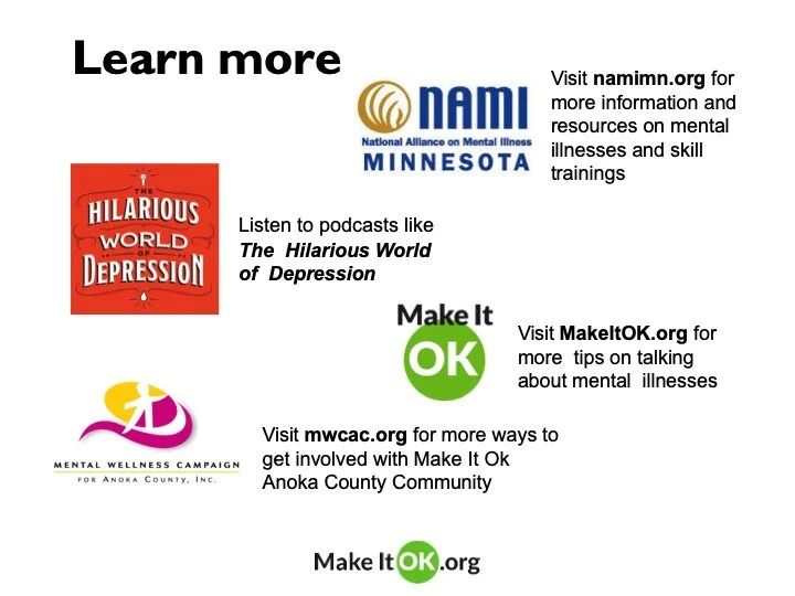 The Make It Okay Anoka County Community group plans to continue our efforts, with additional community presentations and outreach specifically focused on the business and faith communities. If you are interested in learning more or scheduling a presentation for your workplace or community group, please contact us at MWCACsuccess@gmail.com.